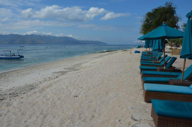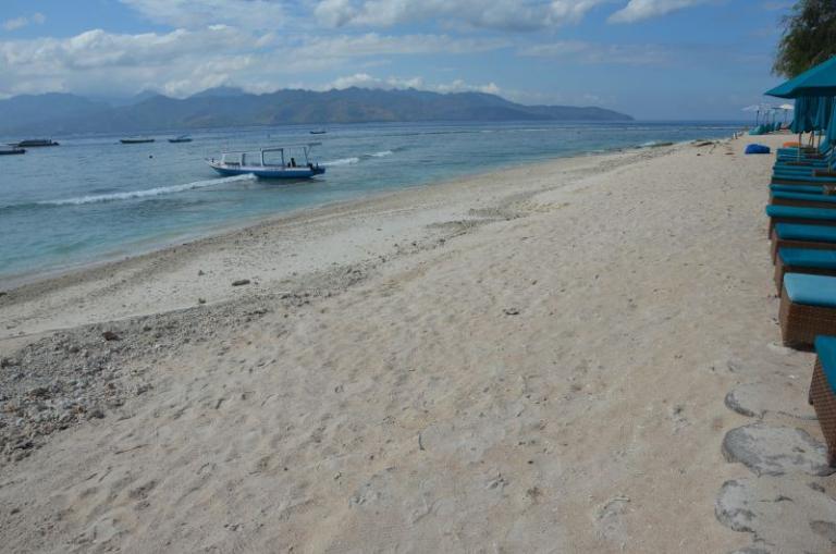 > direkt am schönen Sandstrand, nur durch die Uferstraße (nur ein schmaler Weg, denn es gibt keinen Autoverkehr auf der Gili Trawangan)