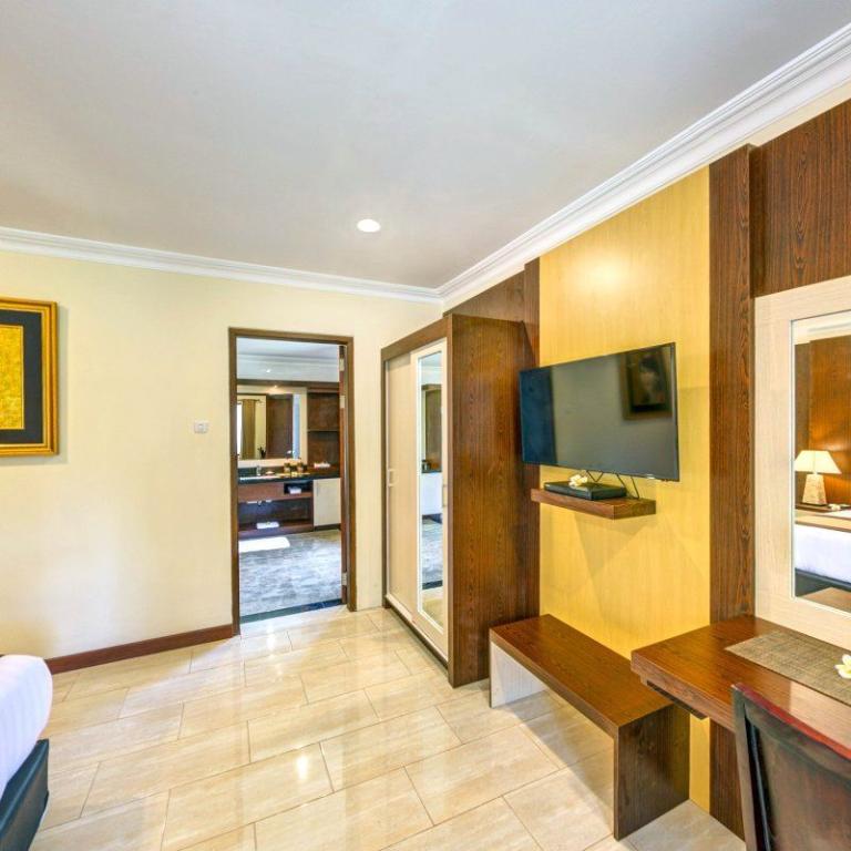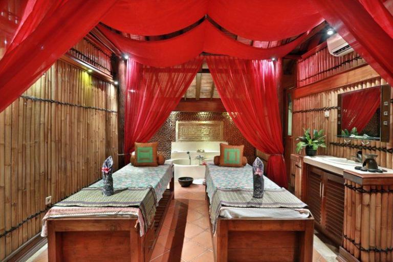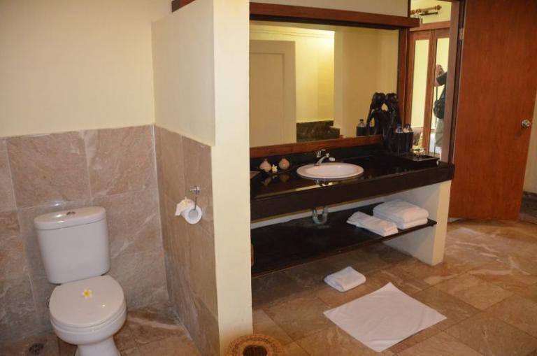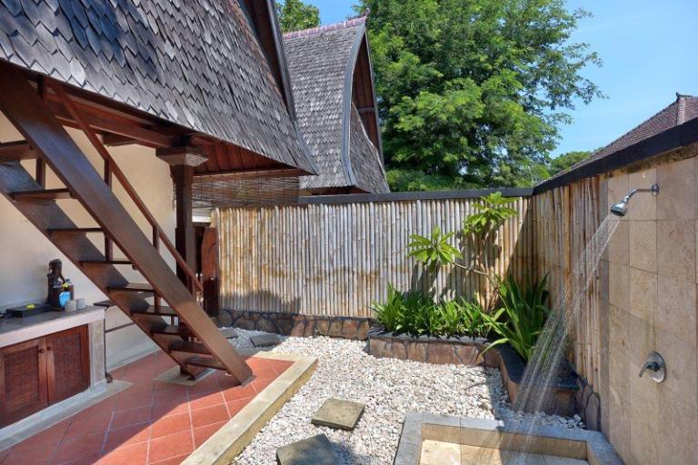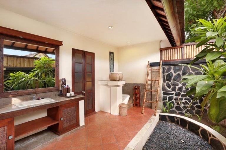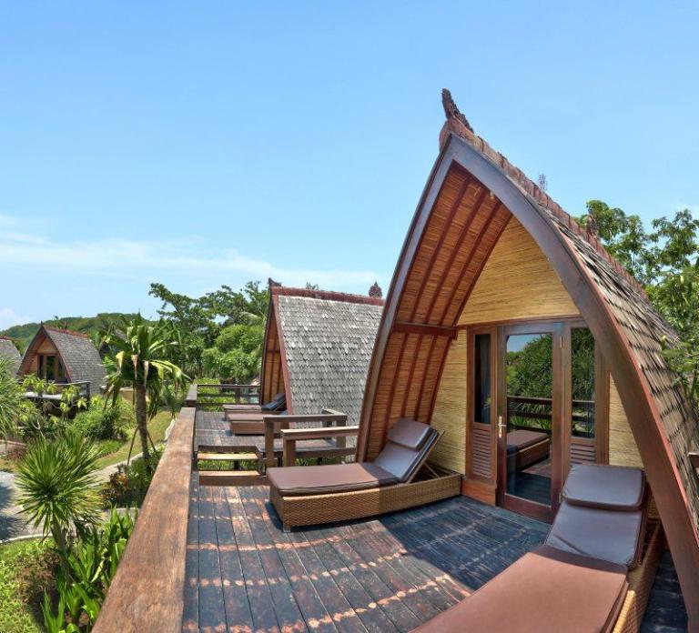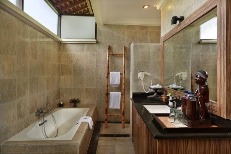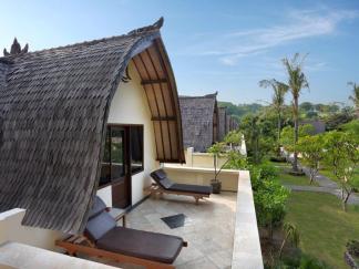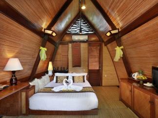 > Traditional-Lumbung-Hut: Lage: im Bungalowgebäude, 1 Schlafzimmer, 1 Wohnraum, durch Stufen abgetrennt, Bad oder Dusche/WC, Außenbad, Flachbildschirm, Sat.-TV, Sitzecke, Telefon, Balkon, Safe (inklusive), Minibar (gegen Gebühr), Klimaanlage, min. Belegung (Erwachsene + Kinder): 1+0, max. Belegung (Erwachsene + Kinder): 2+0