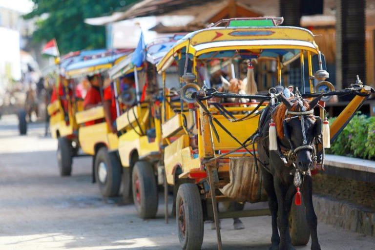 Die Insel Gili Trawangan hat eine sehr gelassene Atmosphäre. Mit Pferdekutschen und Fahrrädern können Sie die Schönheiten der autofreien Insel erkunden.