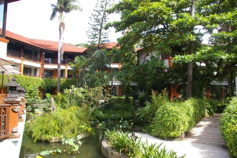 Die 3 bis 4-stöckigen Hotelgebäude sind mit balinesischen Stilelementen verziert, Bali-Flair vermitteln auch die Lobby mit angegliederter Bar und das schöne Spa Center.