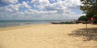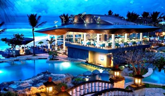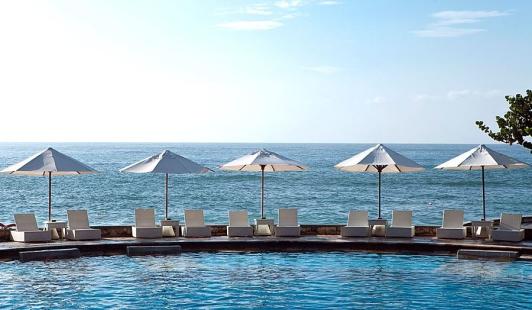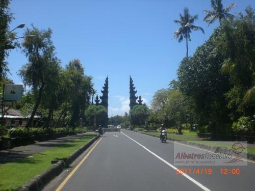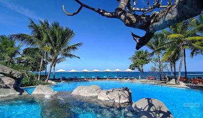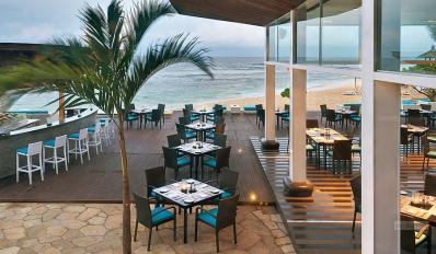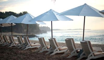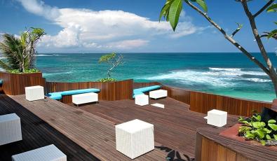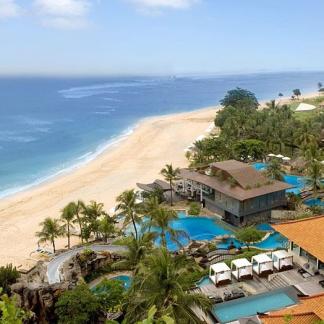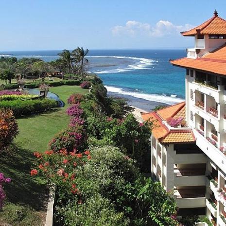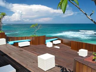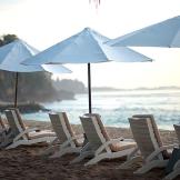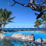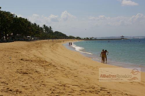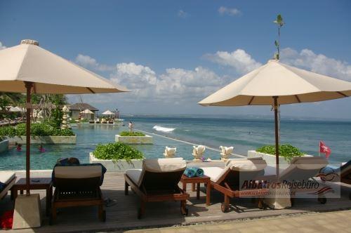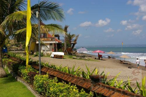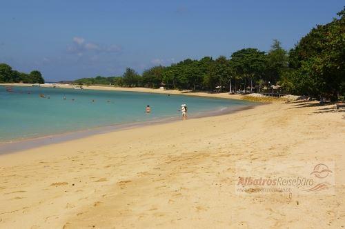 Eingebettet in die Strandklippen der Naturlandschaft von Selantan, die hier eine ruhige Sandbucht bilden. Nach Nusa Dua (5 Fahrminuten) verkehrt ein Shuttle-Bus gegen geringe Gebühr. Die Bademöglichkeiten sind etwas durch die Gezeiten beeinflusst, bei stärkerem Wind höherer Wellengang.