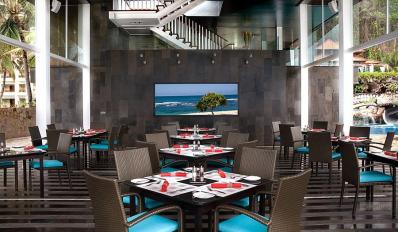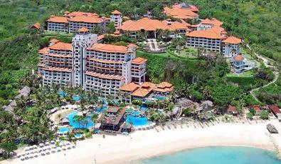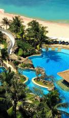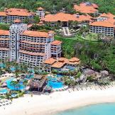 Das beeindruckende Luxusresort schmiegt sich geradezu an die steilen Felsen. Bereits beim Betreten der luxuriösen Open Air Lobby wird der Gast mit einer leichten Meeresbrise begrüßt, der anschließende Blick auf den ca. 40 Meter weiter unten liegenden Strand lässt jedes Urlauberherz höher schlagen. Eine imposante Wasserlandschaft mit 4 zusammenhängenden Pools, Wasserfall, Whirlpool und 30-Meter-Rutsche auf Meeresniveau sowie ein Kinderpool mit aufgeschüttetem Sandstrand bilden den Kern der Anlage (Liegen und Schirme am Pool und am Strand ohne Gebühr). Das Hotel verfügt über diverse Spezialitätenrestaurants (Pizza/Pasta, Coffee Shop, chinesische Küche, japanische Spezialitäten und Seafood-Grill) und 2 Bars. Eine große Auswahl an Tagesaktivitäten, Tennishalle, Wassersportangebote, umfangreiches Spa-Angebot in einer der 8 Spa Villen, Shops und medizinische Versorgung stehen bereit. Für die Kinder gibt es ein Spielzimmer, Babysitter, Kamelreiten am Strand und ein Dschungelcamp.