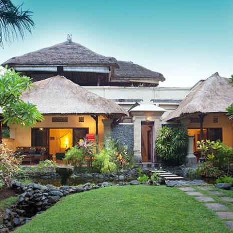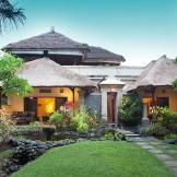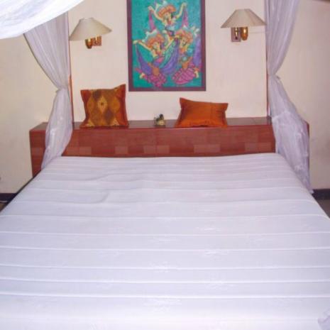 Zur Grundausstattung der im traditionellen balinesischen Stil gehaltenen Zimmer gehören Bad/WC, Außendusche, Klimaanlage, Safe und Veranda. Die Standardzimmer (3 Sterne) in Reihenbungalows liegen im mittleren Bereich der Anlage, der Typ Gardenview Cottage (zumeist einzelnstehend) liegt etwas näher zum Pool/Strand, ist geräumiger und bietet zusätzlich eine Minibar.