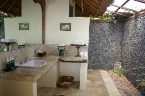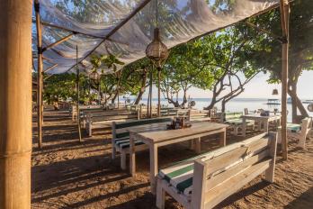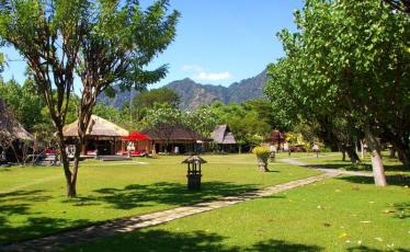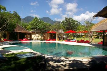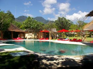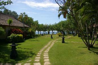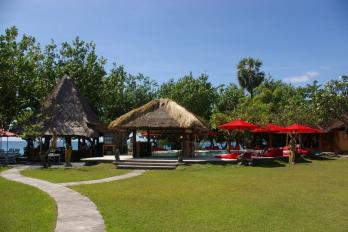 Direkt am feinsandigen, dunklen Lavastrand im Nordwesten Balis bei Pemutran. Die idyllische Umgebung zeichnet sich durch das großartige Panorama der Bergketten des West Bali Nationalparks aus, schon direkt vor dem Hotel finden Sie fischreiche Riffe (auch die künstlichen Riffe des "Reef Garden Projects"). Menjangan, ein ideales Tauchgebiet, ist schnell erreichbar. In der Nachbarschaft (entlang des Strandes) gibt es weitere Resorts mit günstigen Restaurants, entlang der Straße können Sie Früchte, Kekse und Getränke in den landestypischen Tante-Emma-Läden ("Warung") erstehen. Angenehm: die Bewohner der Gegend sind freundlich und interessiert, dabei aber zurückhaltend (z.B. keine oder kaum Strandverkäufer). Der Transfer vom Internationalen Flughafen im Süden der Insel dauert gut 4 Stunden und führt zum Teil durch spektakuläre Landschaften. Fahrten während der Dunkelheit sind möglich, dauern aber länger. Bei Abflügen vor 13.00 Uhr fällt ein Zuschlag in Höhe von Euro 24 pro Wagen an. Hinweis: keine Reiseleitung vor Ort (aber telefonische Erreichbarkeit).