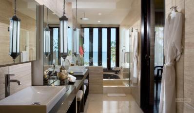Die Suiten (ca. 75 m²) befinden sich im Bereich des Beach Wings, dort zusätzlich Sitzbereich und Jacuzzi-Wanne (mit Meerblick) im Bad.